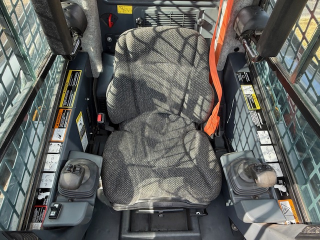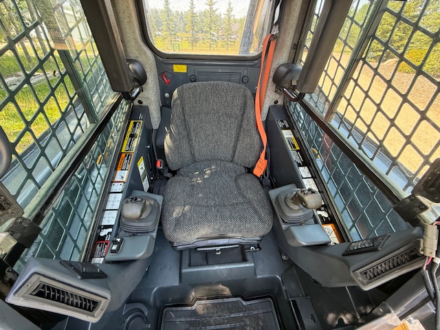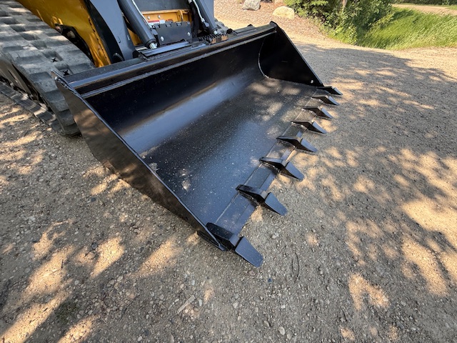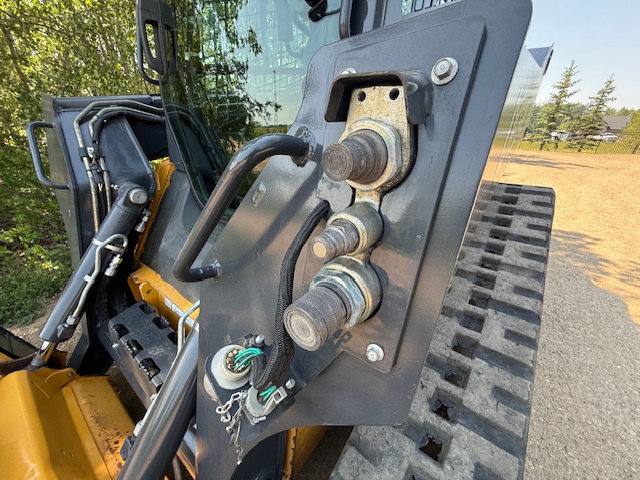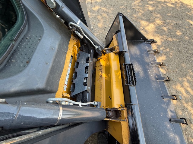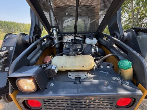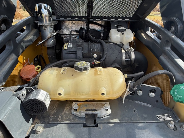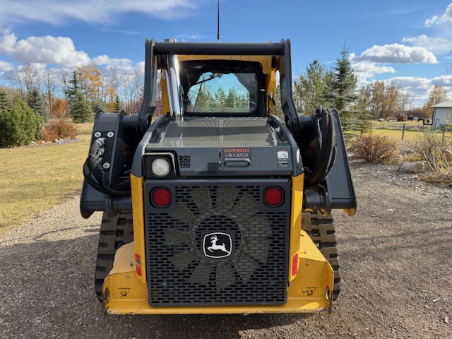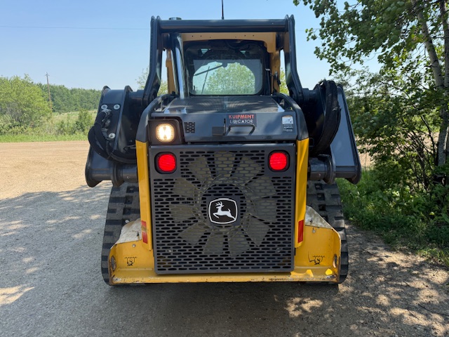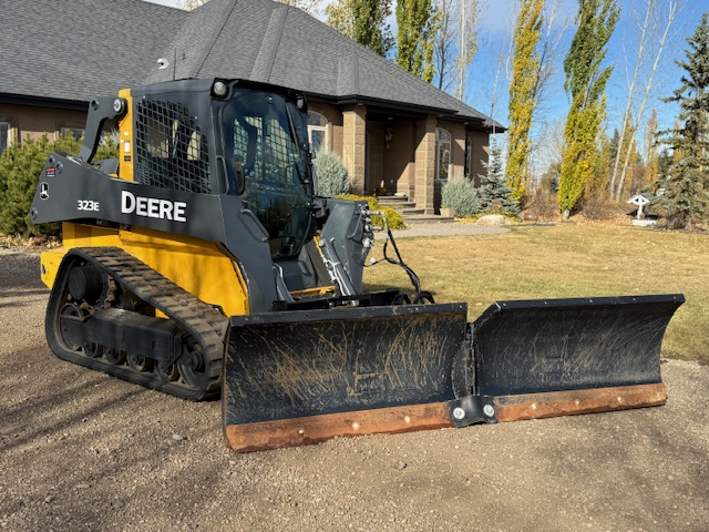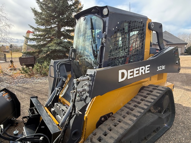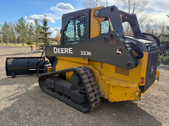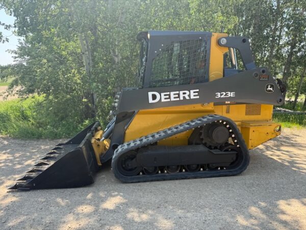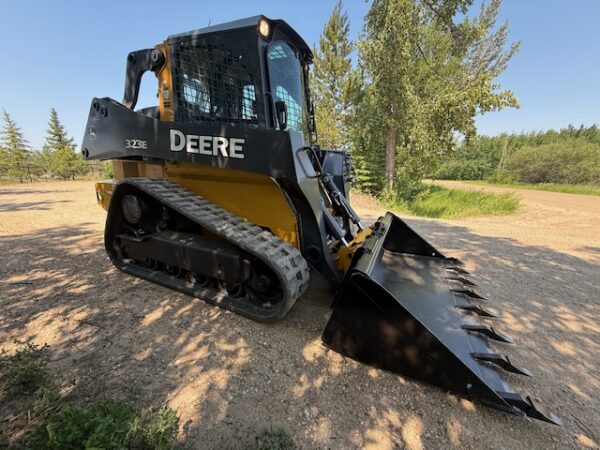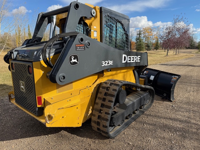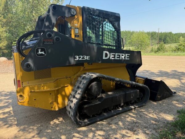 The John Deere 323E compact track loader has a gross power of \(54.8\) kW (\(74\) hp) and a net horsepower of \(52.5\) kW (\(70\) hp). Its operating weight is \(4,286\) kg (\(9,440\) lbs), and it has a rated operating capacity of \(1,176\) kg (\(2,590\) lb). Other key specifications include a tipping load of \(3,360\) kg (\(7,400\) lb), a standard track width of \(320\) mm (\(12.6\) in), and a fuel tank capacity of \(70\) L (\(19.0\) gal)