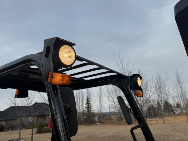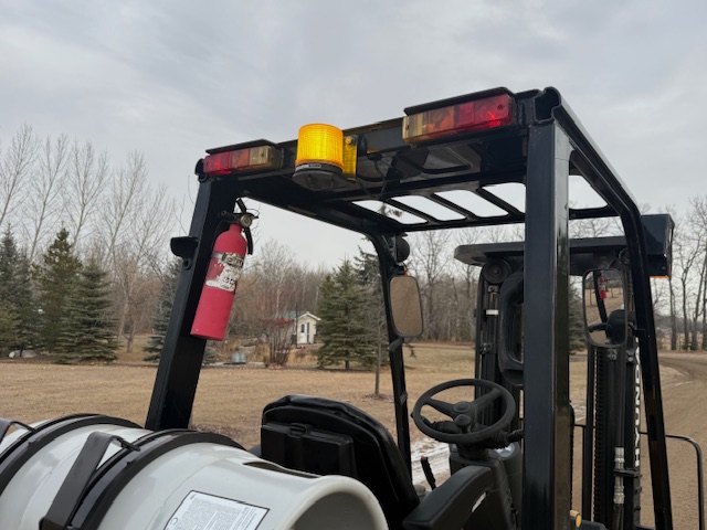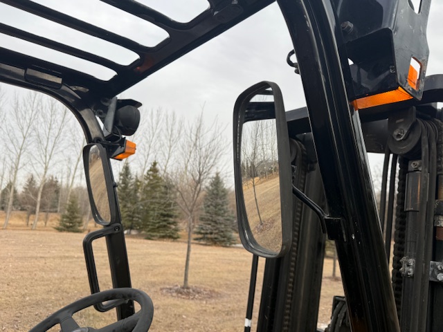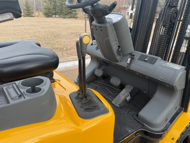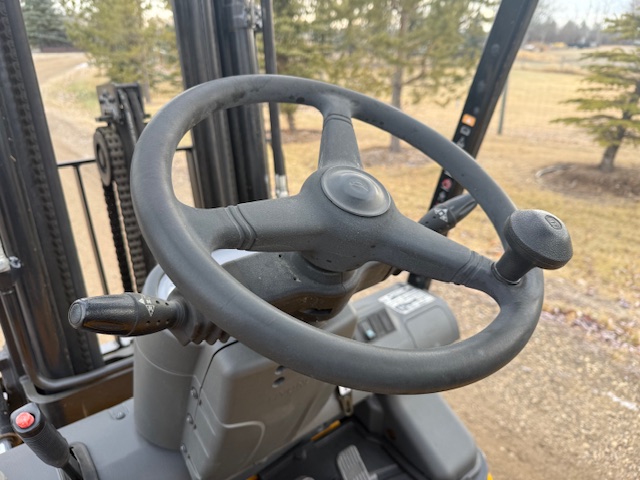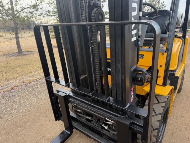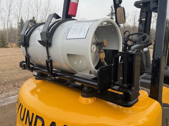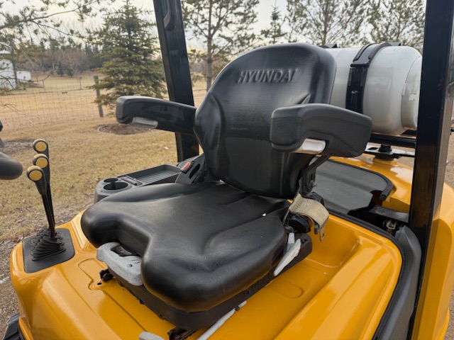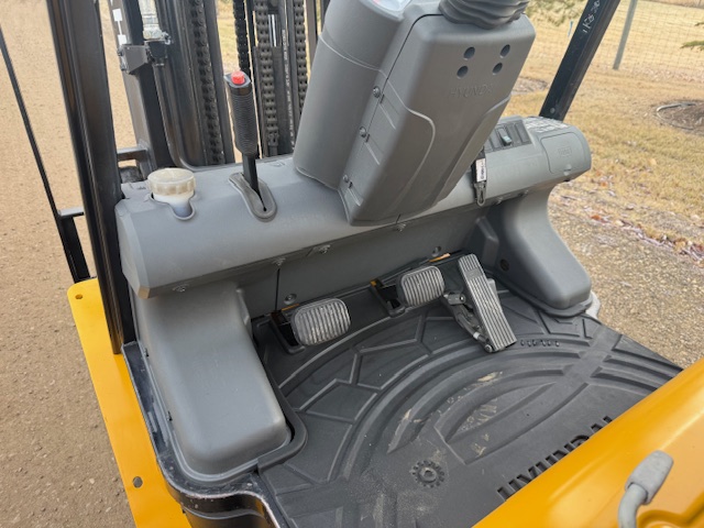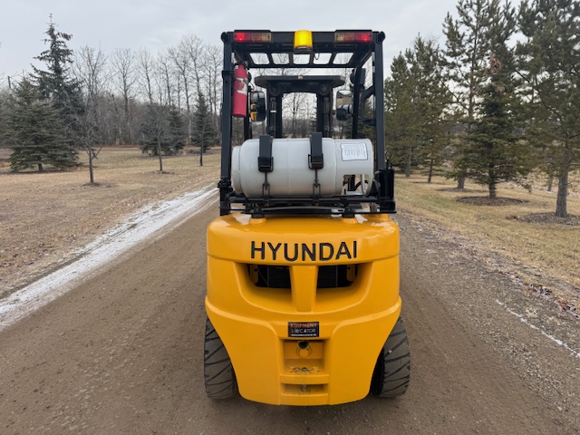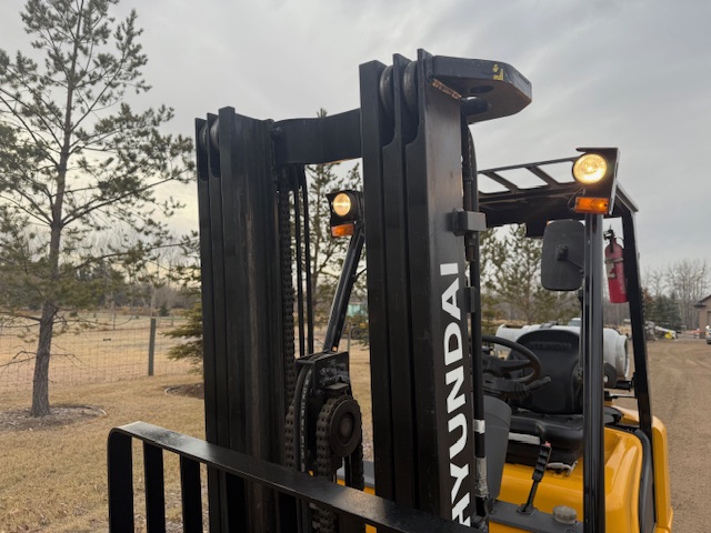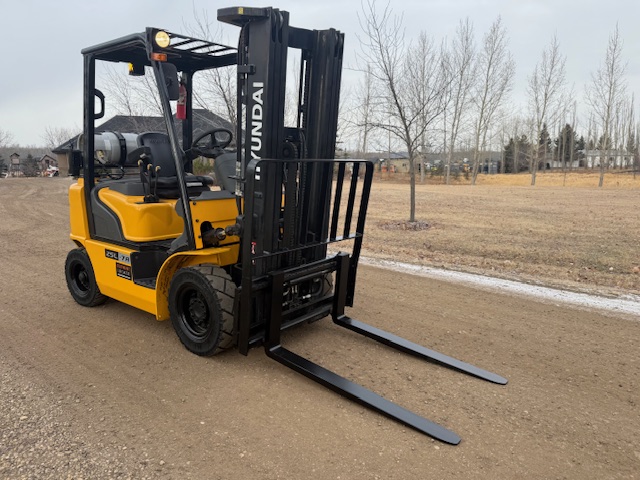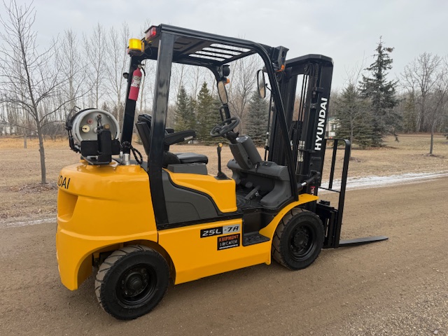 The Hyundai 25L-7A forklift has a 5,000 lb load capacity, an HMC L4KB engine, and a turning radius of approximately 90.5 inches (2298 mm). Other key specifications include a 24-inch load center, a 60 hp engine, and a travel speed of up to 11 mph unloaded.