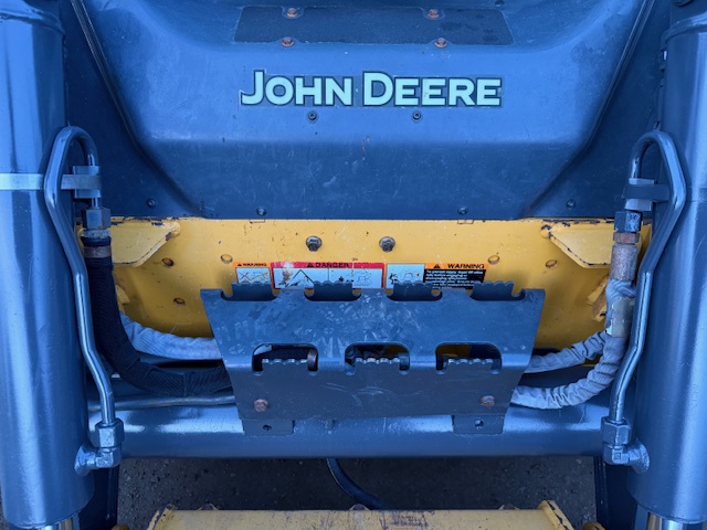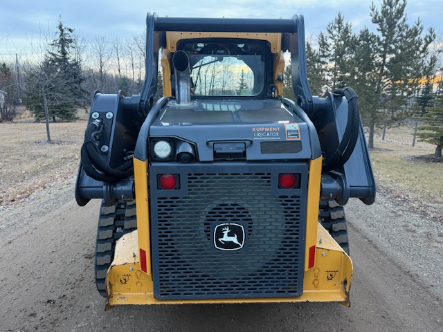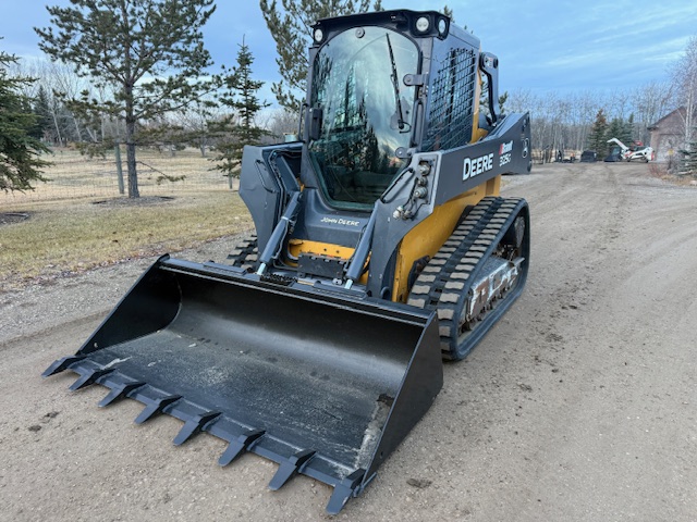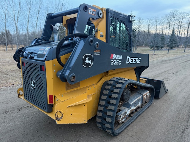 The John Deere 325G compact track loader has a net horsepower of \(52.5\) kW (\(70\) hp), a rated operating capacity of \(1176\) kg (\(2590\) lbs), and an operating weight of \(4313\) kg (\(9500\) lbs). Key specifications include a Yanmar \(3.3\) L turbo engine, a maximum speed of \(13.2\) kph (\(8.2\) mph)