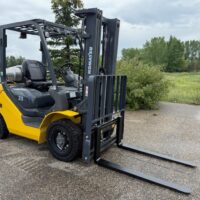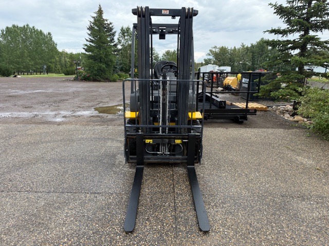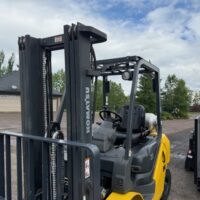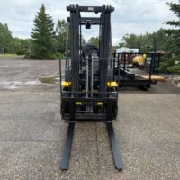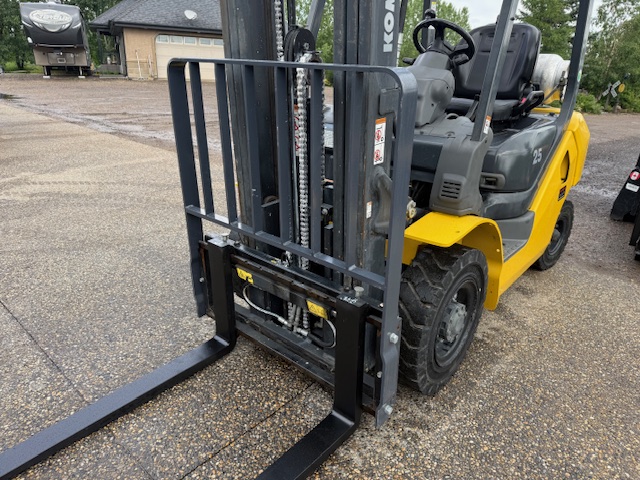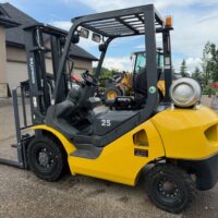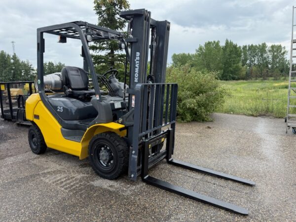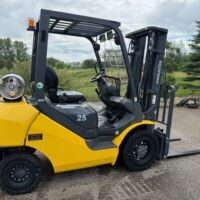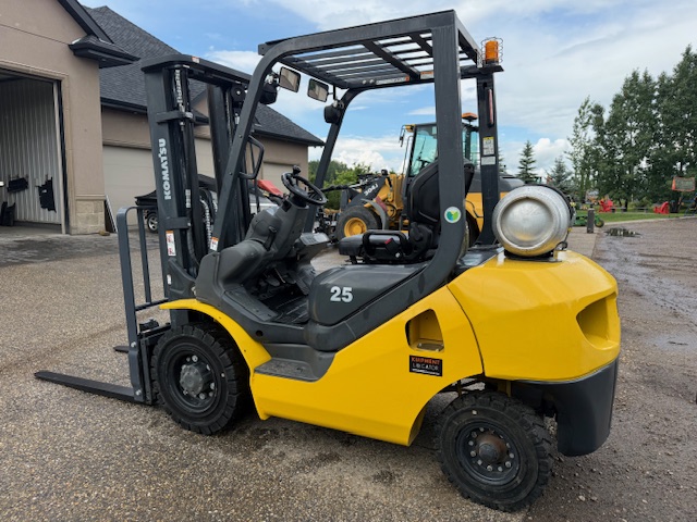 The Komatsu FG25T-16 is a 5,000 lb capacity pneumatic tire forklift, powered by LP gas. It features a 3-stage mast with a lowered height of 87 inches and a raised height of 183 inches.
